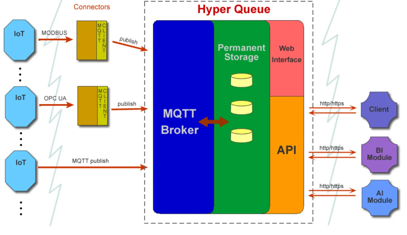 HyperQUEUE assegura a integração mesmo com sistemas não compatíveis nativamente com MQTT, graças aos conectores para conversão de protocolos industriais.