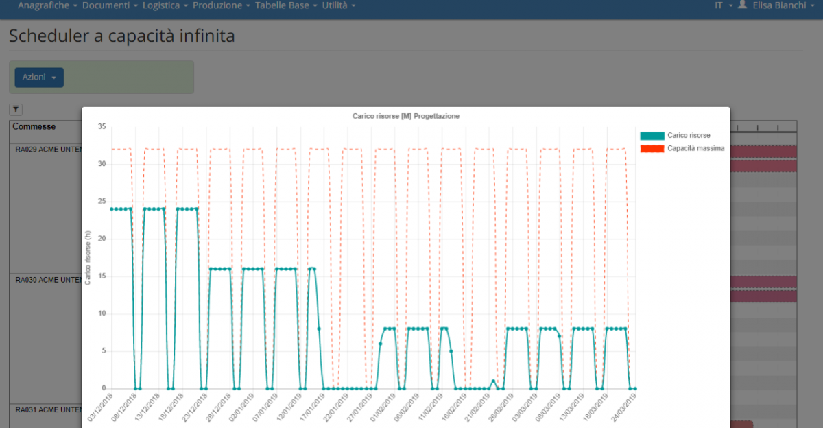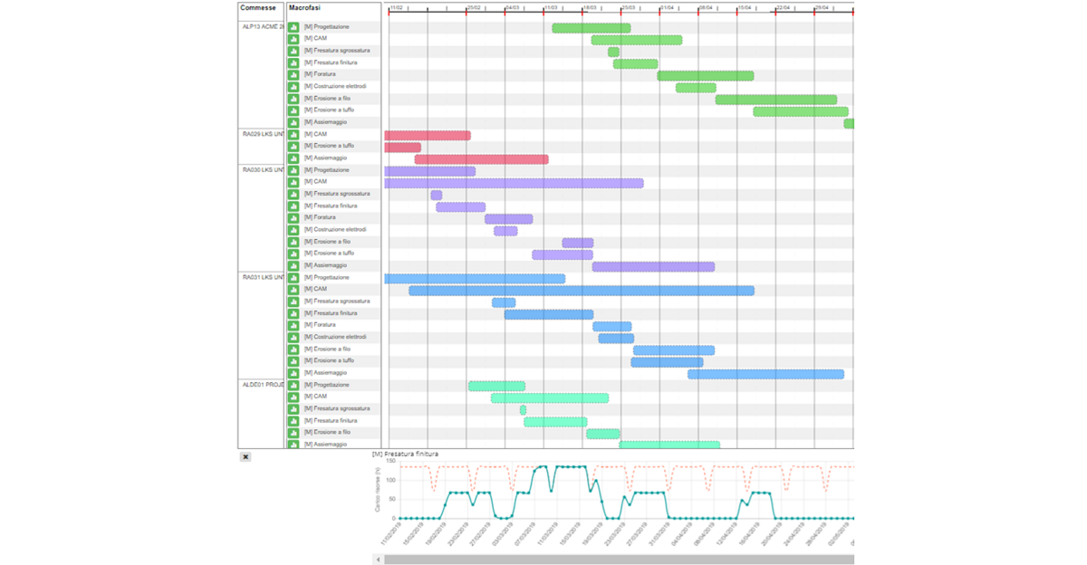 Graças à representação gráfica por meio de um diagrama de Gantt, o HyperSCHED permite monitorar visualmente o uso dos recursos e realizar atualizações, manuais ou automáticas, para melhorar a eficiência produtiva.