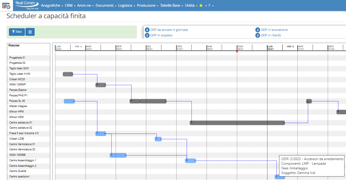Programação da produção no modo forward scheduling (para frente no tempo) ou backward scheduling (para trás).